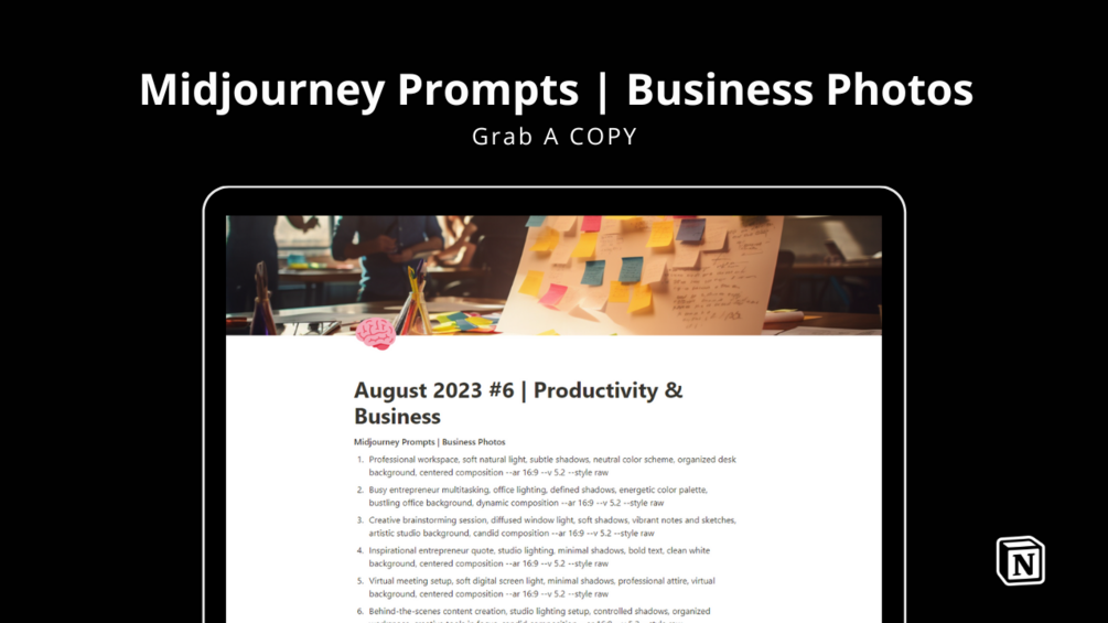 Unlock the power of AI with "#1 | Midjourney Productivity & Business" guide. Learn expert Midjourney prompting skills for graphics creation, freelancing, or enhancing your business. Master productivity techniques with ChatGPT prompts for focused work, time management, and more.